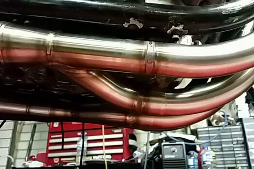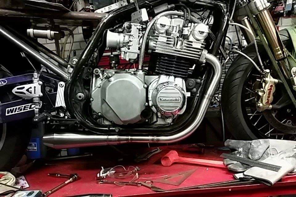 received_10206685687240476 A crazy 1 1/2″ 4 into 2 system exiting into 2″ reverse cone muffler. The mufflers had to sit inside the frame and the outer section of header pipe was to remain tight and follow the profile of the frame. Custom lower bends were made to copy the frame radius with my own 2 into 1 merge collectors. This bike is an absolute beast with Mikuni RS34 pumper smooth bores, 810cc barrels and a super lumpy cam…more on this bike later 🙂received_10206685687640486