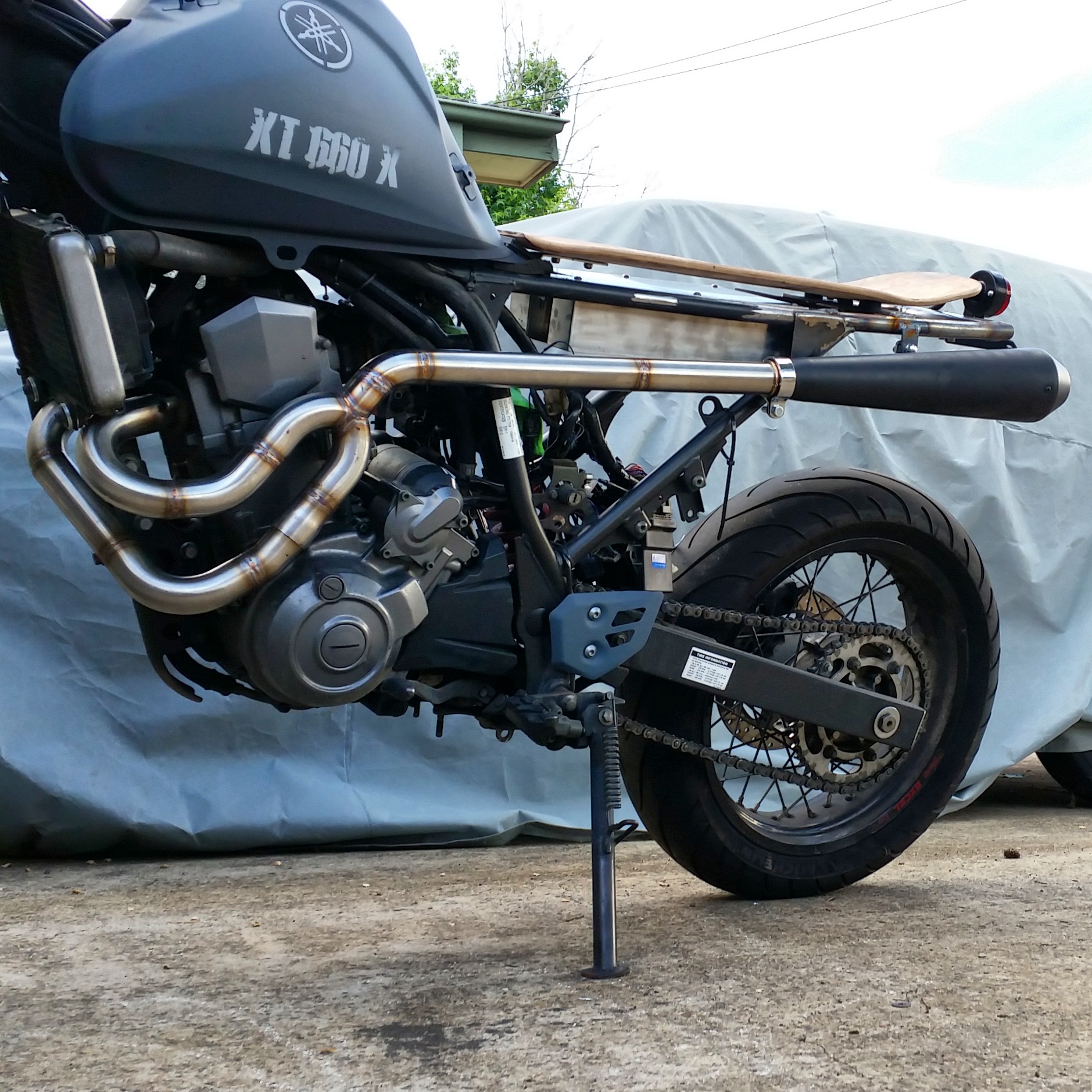 Yet another S/S system for Mr X’s Tracker. Looks a little weird from this angle but in the flesh it just works a treat. Mr X wanted a high pipe angled up to exit the rear of the bike into a matt black reverse cone muffler. A nice little Tracker build this one.IMG_20141202_155815IMG_20141202_165730